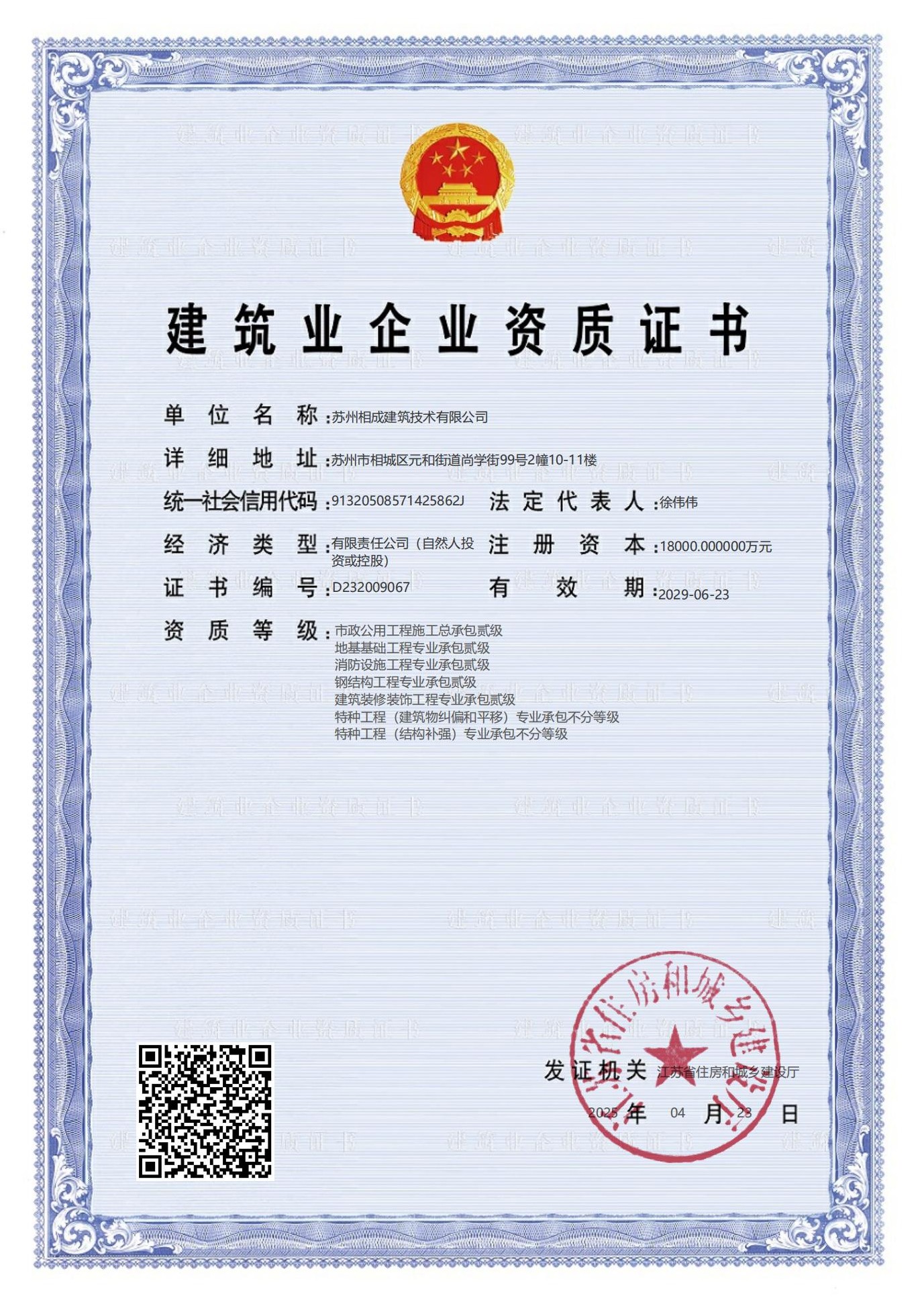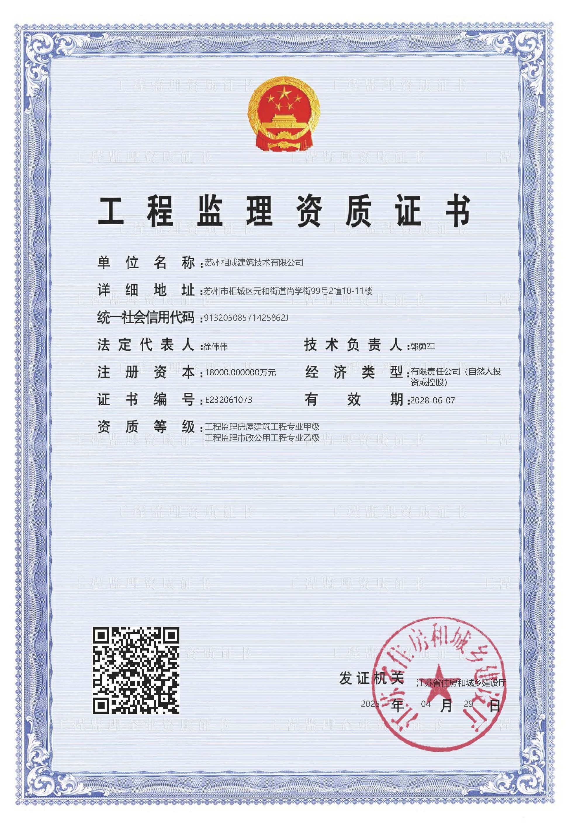 蘇州相成建筑技術有限公司是一家以提供建筑開發(fā)服務為主的建筑企業(yè),公司位于蘇州市相城區(qū),成立于2011年3月,注冊資本 10000萬,歷經13年的努力于2022年7月獲省住建廳頒發(fā)房屋建筑工程施工總承包壹級資質,市政公用、建筑裝飾、地基基礎、消防設施、鋼結構工程等專業(yè)承包二級資質; 2023 年6月份增設房屋建筑工程監(jiān)理甲級、市政一級監(jiān)理資質;目前是相城區(qū)唯一一家集施工總承包一級和建筑工程監(jiān)理甲級資質的企業(yè)。
